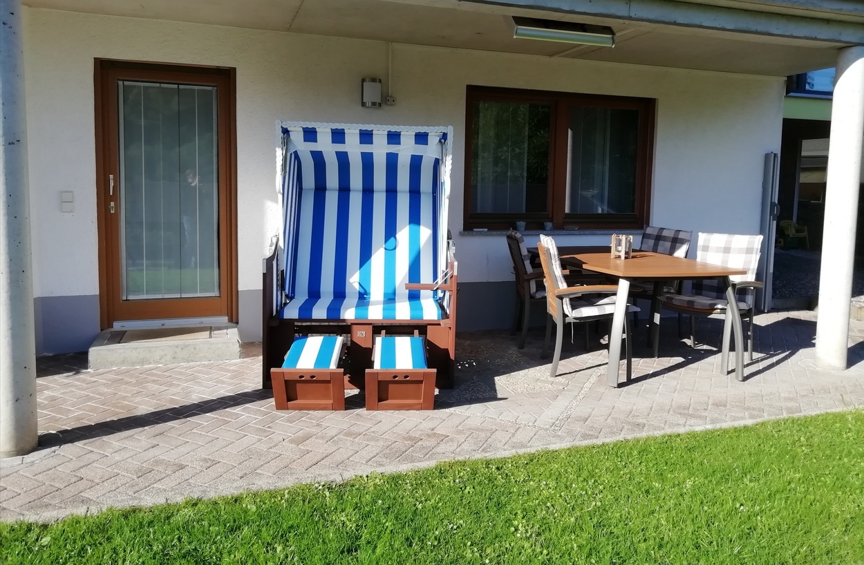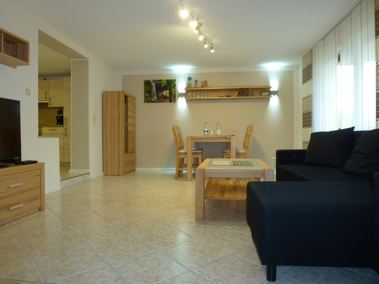 Der Wohn-/ Essbereich ist mit Massivholzmöbel eingerichtet. Für die Freizeit und gesellige Abende zuhause, stehen ihnen Gesellschaftsspiele, ein Tischkicker, Tisch-Tennis und eine Dartscheibe zur Verfügung. Die Ferienwohnung verfügt über 2 Schlafzimmer mit Boxspringbetten. Für Familien mit kleinen Kindern stehen Babybetten, Kinderbetten, ein Wickeltisch, Baby-Badewanne, Babyphone und 2 Hochstühle auf Anfrage zur Verfügung.