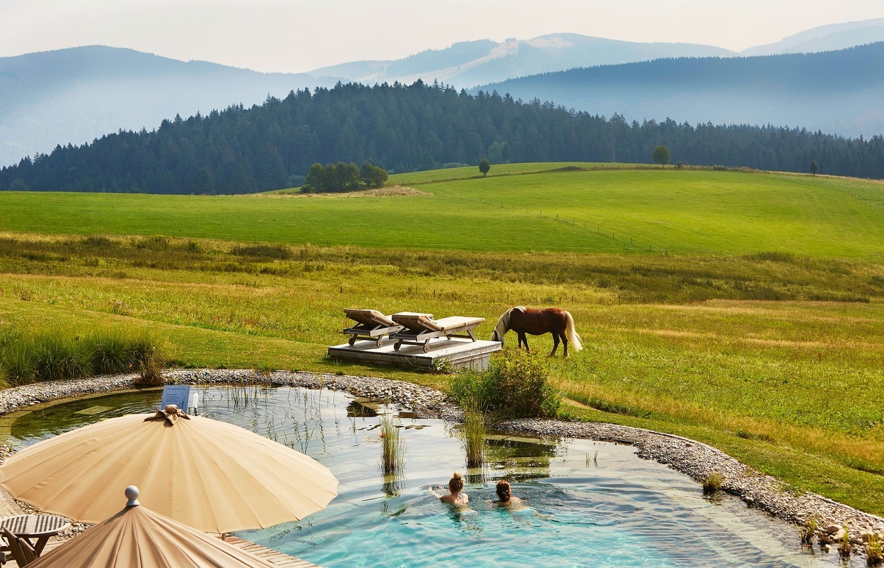 1.147 m Hochgenuss. Mit Panoramablick zum Feldberg. Mit charmanten Gaststuben und hellen Zimmern. Mit kreativ-badischen Speisen und Wohltaten im Badehaus: Kosmetik, Massagen, Saunen, Naturbadeteich.zum Wellnesshotel