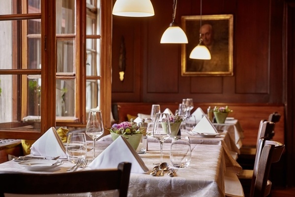 unseren Gaststuben | Nehmen Sie unser Viergang-Abendmenü nicht in Anspruch, schreiben wir Ihnen pro Person/Abend 15,– Euro auf der Zimmerrechnung gut | Grander-Quellwasser steht im ganzen Haus zur Verfügung.