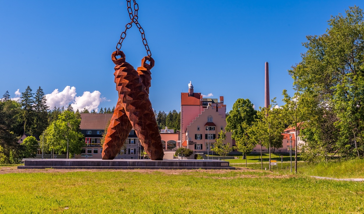 Der Cortenstahl, aus dem das Kunstwerk gebaut ist, fügt sich außerdem wunderbar in den Schwarzwald ein und ähnelt mit seiner rostigen Farbe stark einem echten Tannenzapfen.
