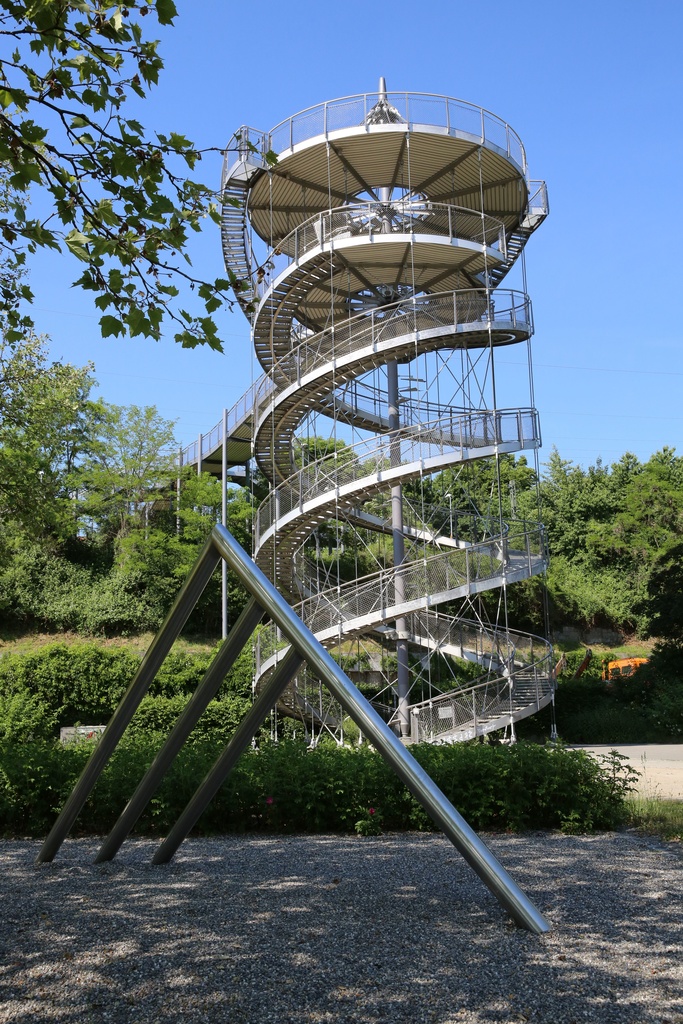 Dank seiner bemerkenswerten Höhe dient der Turm aber nicht nur der Überwindung des Geländesprungs, sondern bietet Besuchern auch einen wunderschönen Blick Richtung Basel, über das Parkgelände und auf das untere Wiesental.