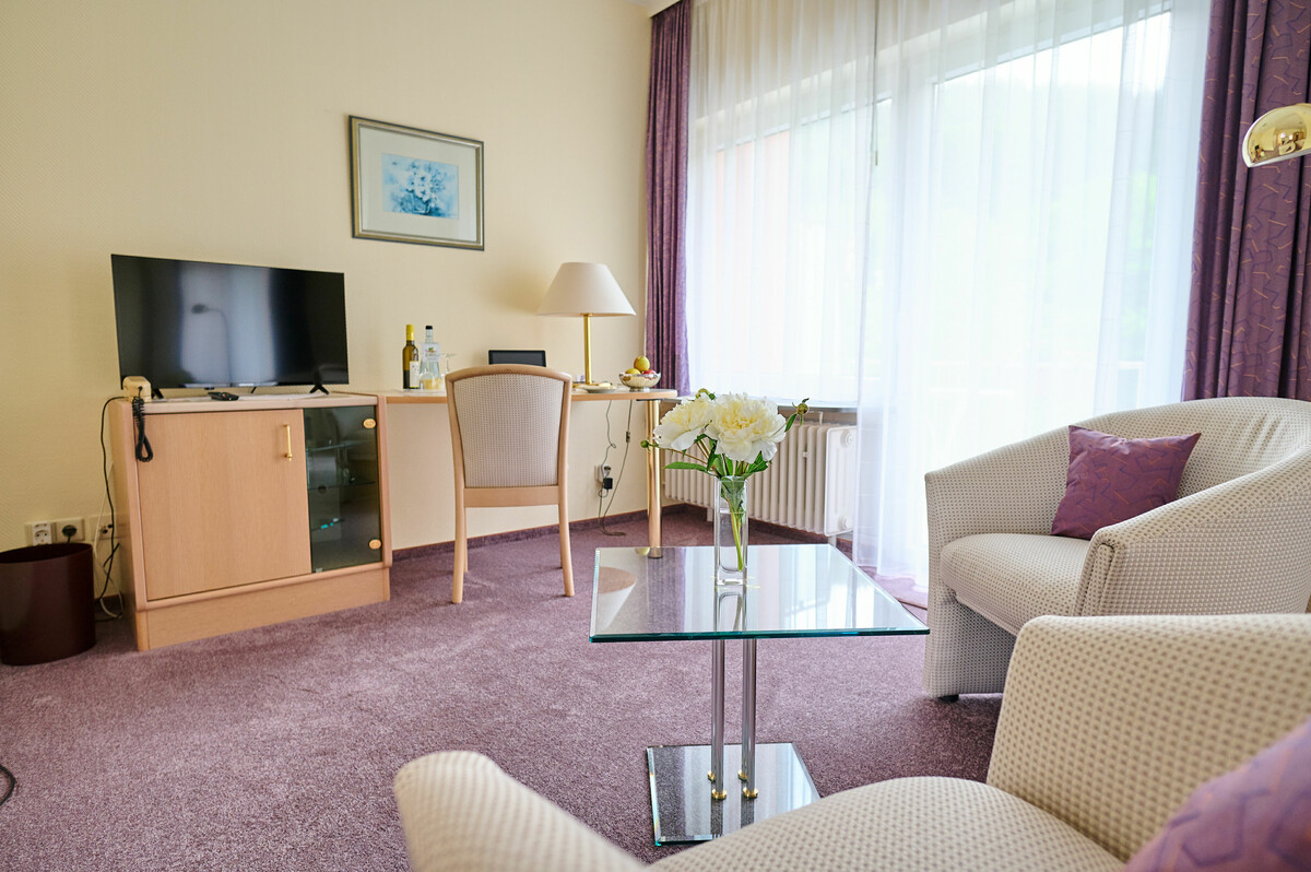 Telefon und Farb-TV sowie Fön im Bad sind selbstverständlich. Für jeden Gast ist ein Bademantel im Zimmer. Die Doppelzimmer und Appartements und ein großer Teil der Einzelzimmer haben Balkon. Die Größe ist je nach Kategorie unterschiedlich.