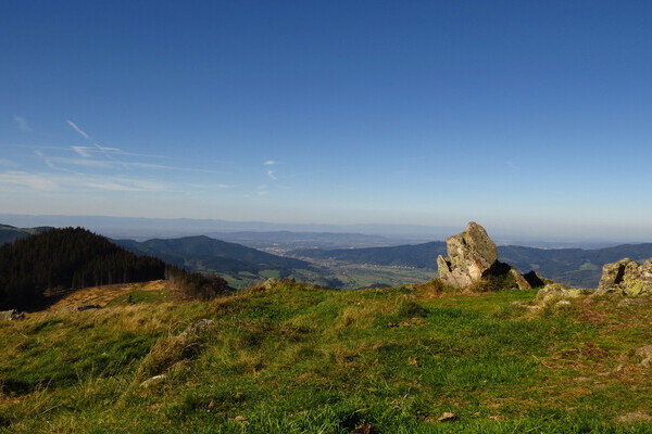 Die offene Gipfelfläche des Hinterwaldkopfes bietet eine herrliche Aussicht über das Dreisamtal bis hin zu Kandel.