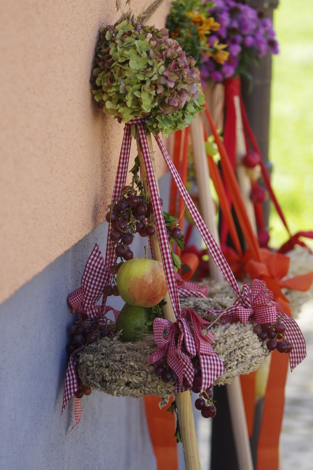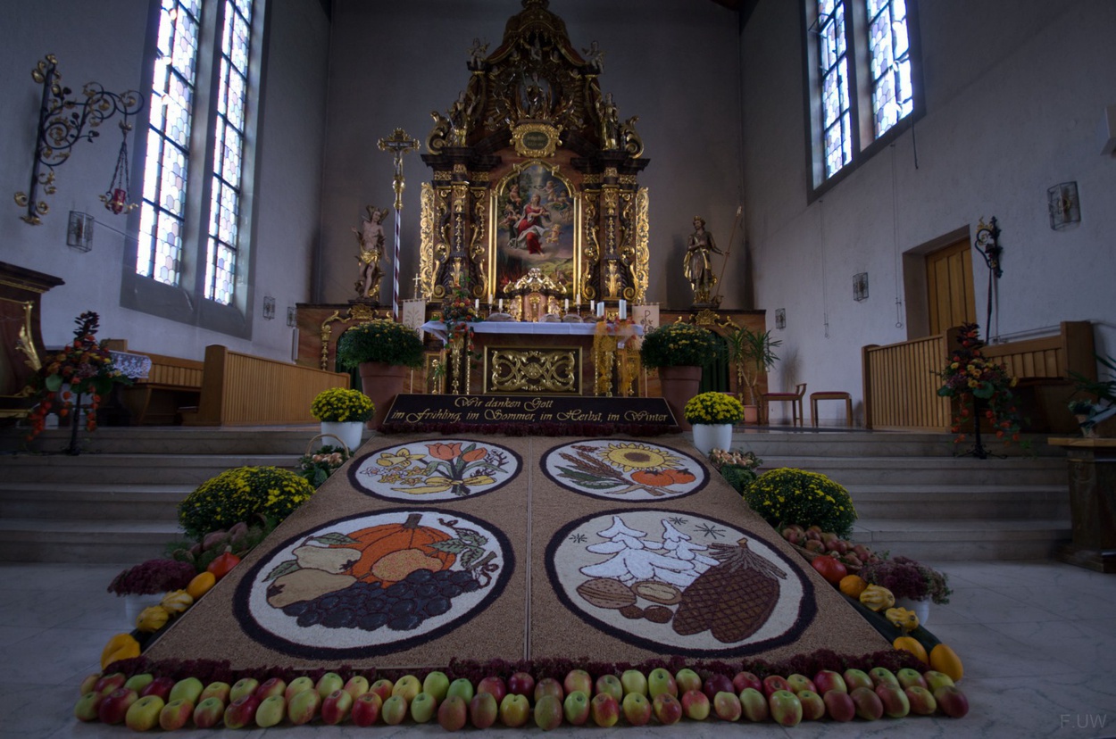 Farbenfrohe Körner- und Früchtebilder mit biblischen Motiven sowie der beeindruckende Erntealtar schmücken am Erntedankfest die katholische Kirche „St. Afra“. Danach kann man die Kunstwerke noch 14 Tage lang in der Kirche bewundern. Bei der Prozession am Festtag, begleitet von der Trachtenkapelle, führen die Kinder wunderschöne Erntestäbe aus Ähren, Kränzen, Kreuzen und Kronen, geschmückt mit Blumen und Obst, mit sich.